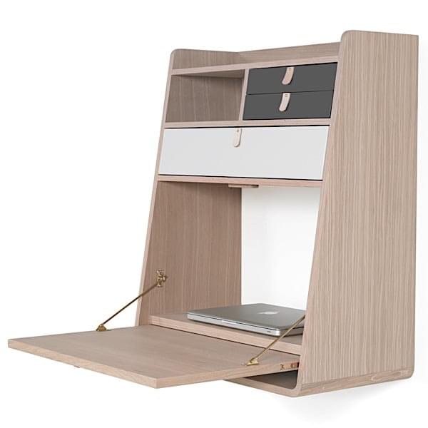 Gaston ist ein fonktionaler und schlanker Sekretär. Die vier Schubladen und die Falttablette erlauben es, eine Fläche von Arbeit und Lagerung auf kleinem Raum zu haben.