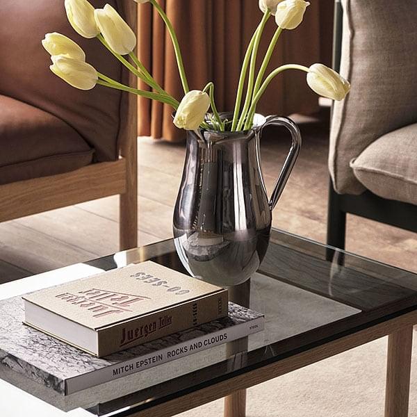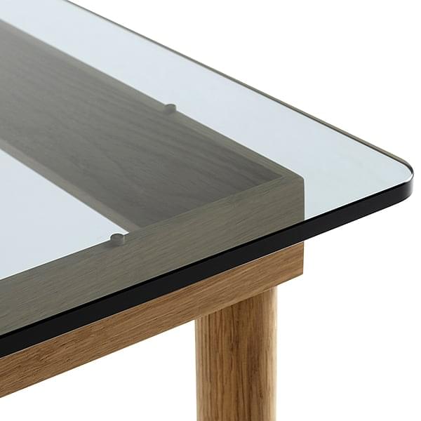 Con un marco macizo de roble o nogal en madera certificada FSCcon laca a base de agua, la parte superior está hecha de vidrio liso o ranurado, que tiene una estructura acanalada distintiva.