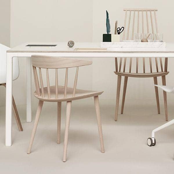 La silla J110 está hecha de madera de haya en madera natural y 4 colores. Tiene la misma altura de asiento que otras sillas de comedor, pero debido al respaldo alto tiene cierto parecido con una silla de salón.