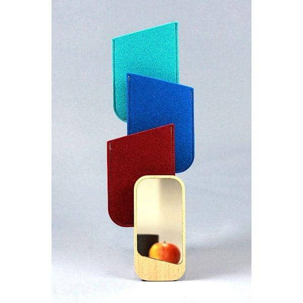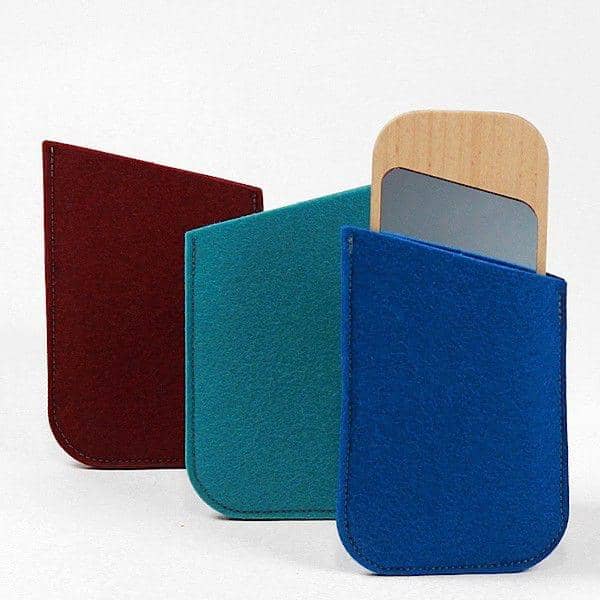 Miroir de poche réalisé en hêtre massif issu de Forêts gérées durablement, miroir en verre sans cuivre, pochette 100 % pure laine de mouton - fabriqué en Franche-Comté (France).