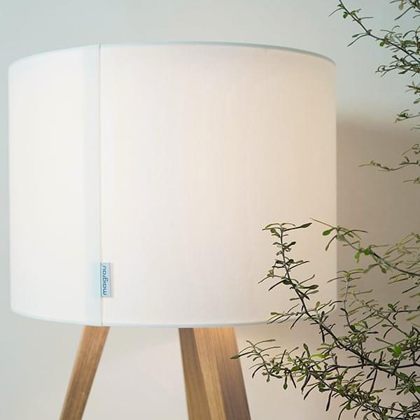 Il design puristico della lampada è messo in scena dalla combinazione di rovere oliato e tessuto dell'azienda JAB-Anstoetz.