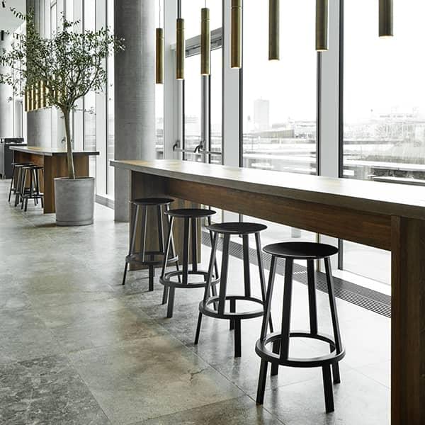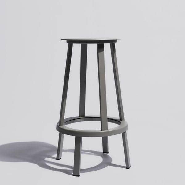 Lo sgabello da bar REVOLVER, di WRONG FOR HAY : disponibili 2 altezze, montato su cuscinetti a sfera in alluminio - Design: Leon Ransmeier