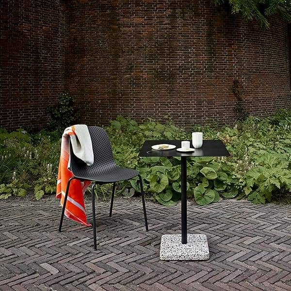 Il tavolo Terrazzo, ideato dal designer svedese Daniel Enoksson, ha un piano rotondo o quadrato realizzato in acciaio elettrozincato, che contribuisce a renderlo molto resistente.