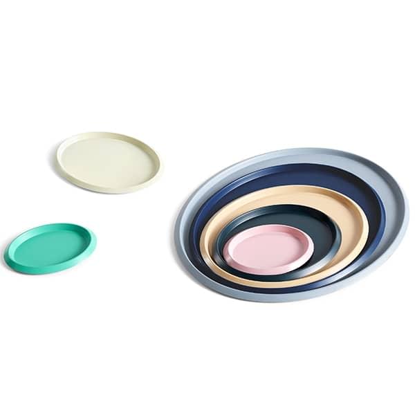 ELLIPSE、楕円形のラッカー塗装スチールトレイ、5つのサイズがあり、あらゆる状況で役立ちます。