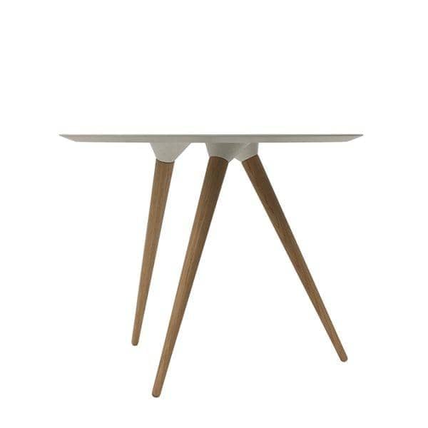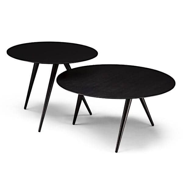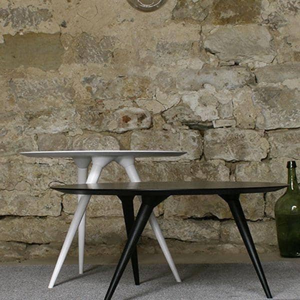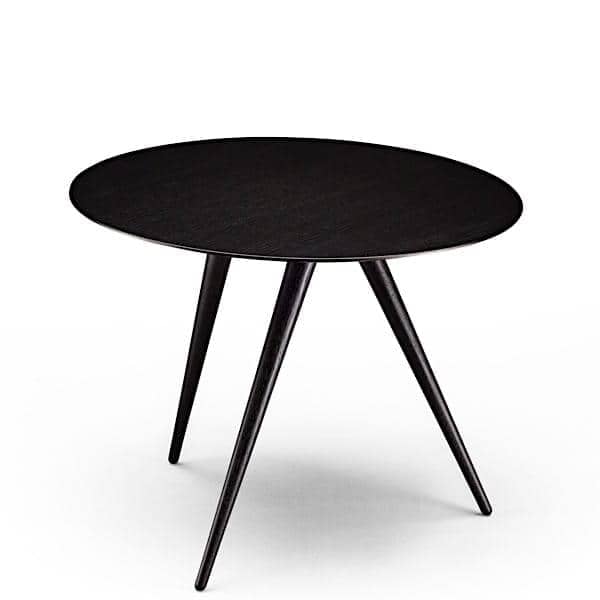 薄い丸いテーブルトップと円錐形のテーブル脚のわずかな回転の組み合わせにより、サイドテーブルはカジュアルでアクロバティックなキャラクターを強調しています。