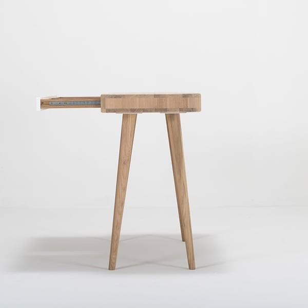 Den solide eikestrukturen står i kontrast til de hvite skuffene i MDF fiberpaneler, som gjør at du enkelt kan lagre hverdagens gjenstander. Dette pene møbelet kan også være til stor nytte for deg som et kompakt ekstra skrivebord.