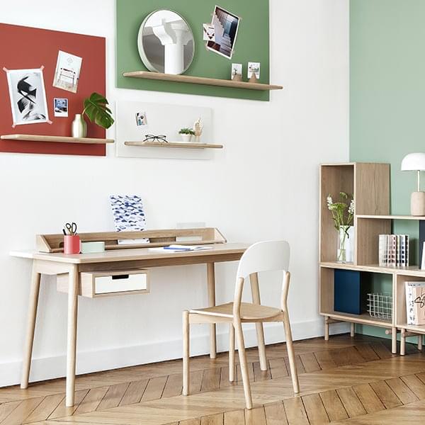 Bestående av et bord i MDF finert med eik og et skrivebord med føtter i fast eik, er Honoré laget for å være funksjonell. Strømstrimlene og annet tilbehør er skjult inne i pulten for å unngå overfylt arbeidsflate.