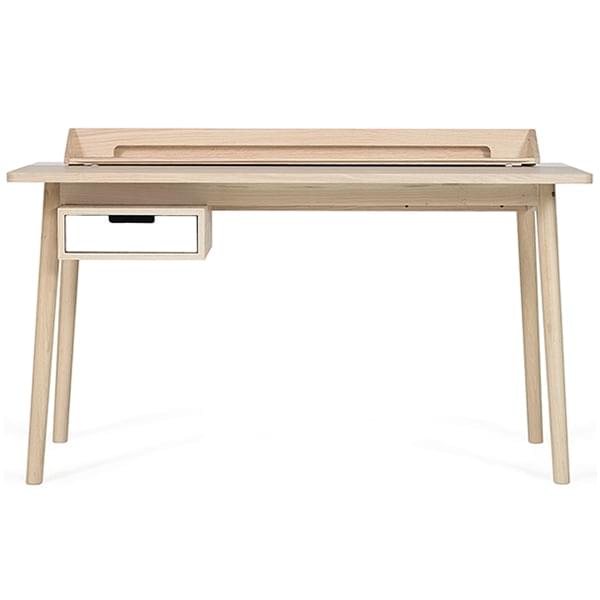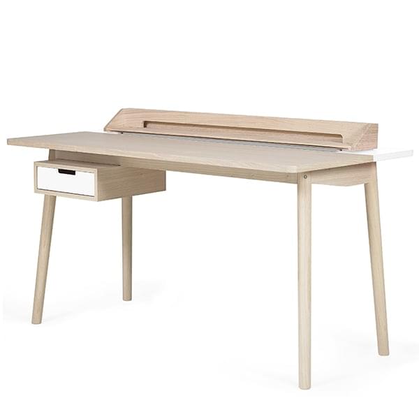 Skrivebordet er flyttbart takket være skøyter og hjul, slik at du kan lagre ulike tilbehør. Skuffen og baksiden av pulten er farget i kontrast til det vakre treet i skuffen og føttene, flere forskjellige farger kan velges.