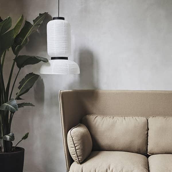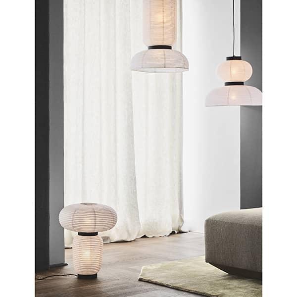 Håndlaget med rispapir ved å slå sammen forskjellige størrelser og former, består serien av lamper av tre forskjellige pendelversjoner og en bordlampe. disse vakre lampene er laget av elfenben hvitt rispapir med svart beiset eikeaksenter.