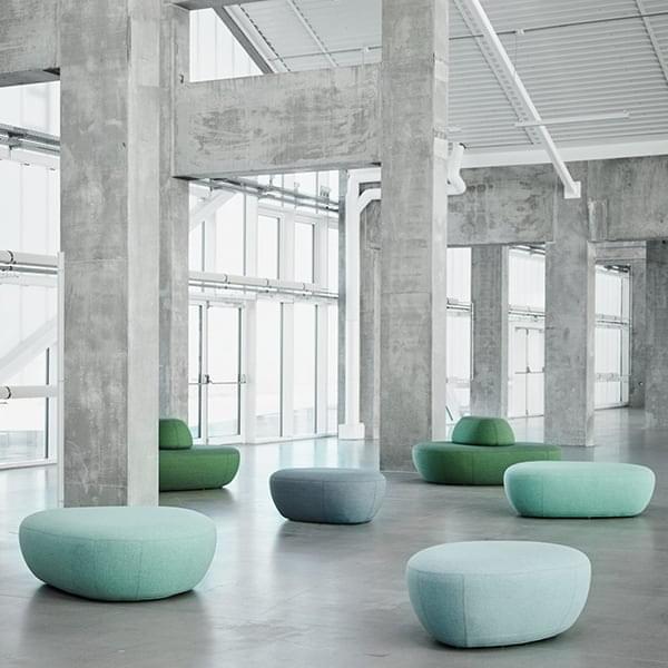 Dette tillater ubegrenset kreativitet. Designen er myk, lett og økologisk og kommer i tre størrelser som kan kombineres eller brukes alene. Den største størrelsen har en komfortabel ryggstøtte, noe som gjør den perfekt for installasjoner i store venteområder og fellesarealer.