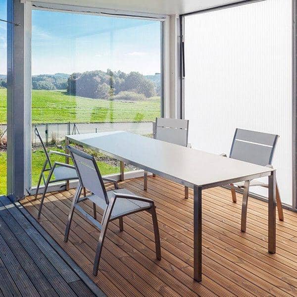 Disse spisebord er laget av de fineste materialer. Rustfritt stål for rammen, HPL, sikkerhetCLEARVISION glass eller keramikk for tabellen skuffen.