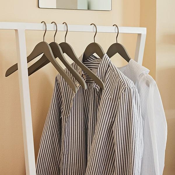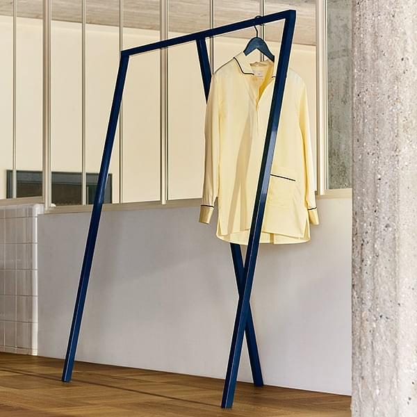 LOOP stå garderobe ved HAY er en forenkling av det industrielle trestle og designet med tre ben.Det er en samling av bukker i tre høyder - salongbord, spisebord og høy bord - og garderobe står i to lengder.