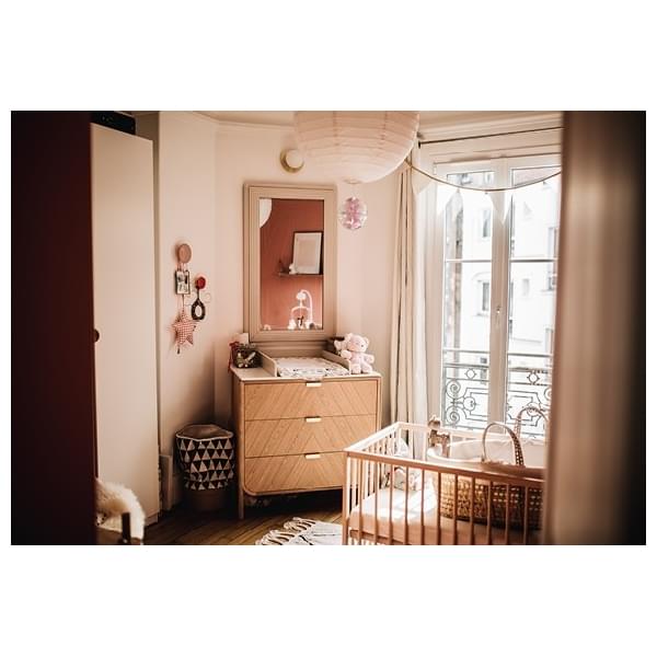 Marius é uma caixa de gavetas cujas pernas estão em carvalho maciço, enquanto o resto da peça de mobiliário é em carvalho chapeado em MDF. As portas, ricas em padrões, são realçadas por uma cor ou pela beleza natural da madeira envernizada. As três gavetas desta cômoda são entregues separadamente para não danificar o padrão ea cor.